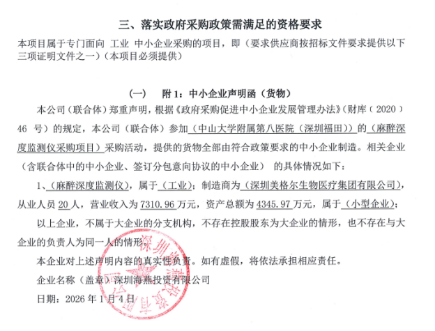 | A | 深圳海燕投资有限公司 | 1)营业执照(或事业单位法人证书)等证明资料复印件;2)法定代表人证明书;3)法定代表人授权书;4)政府采购投标及履约承诺函;5)招标代理服务费承诺书;6)投标报价;7)《供应商基本情况表》、社保缴纳证明材料;8)签约承诺函;9)若投标供应商为所投产品的生产企业,必须提供《医疗器械生产企业许可(备案)证》且生产范围包含该产品,不在住所或者生产地址所在地销售的厂家还需提供医疗器械经营许可证/(第一类/二类)医疗器械经营备案凭证;若投标供应商为所投产品的代理商或授权供应商,必须提供《医疗器械经营企业许可(备案)证》且经营范围包含该产品;10)落实政府采购政策需满足的资格要求:本包组属于专门面向 工业 中小企业采购的项目,即(要求供应商按招标文件要求提供以下三项证明文件之一):(1)制造商应为中、小、微型企业(提供《中小企业声明函》)(2)制造商视同小型、微型企业的残疾人福利性单位或监狱企业(提供①《残疾人福利性单位声明函》或②《监狱企业声明函》及由省级以上监狱管理局、戒毒管理局(含新疆生产建设兵团)出具的属于监狱企业的证明文件)。 结论:资格核查通过。 | ¥90,000.00 |