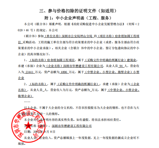 3 | 深圳市上梁营造工程有限公司 | 1)营业执照(或事业单位法人证书)等证明资料复印件;2)法定代表人证明书;3)法定代表人授权书;4)政府采购投标及履约承诺函;5)招标代理服务费承诺书;6)投标报价;7)《供应商基本情况表》、社保缴纳证明材料、股权关系证明材料;8)投标人必须具备有效期内的特种工程(结构补强)专业承包不分等级资质;9)投标人必须具备有效期内的安全生产许可证。 结论:资格核查通过。 | ¥348,898.64 |