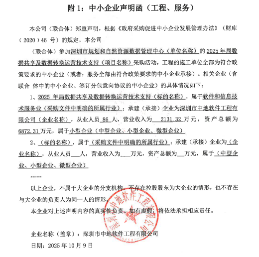 参照国家和深圳市有关招标采购的相关法律法规及政策,中国远东国际招标有限公司(以下简称为采购代理机构)受深圳市规划和自然资源数据管理中心(以下简称为采购人)委托实施采购,本项目2025年9月25日发布采购公告,定于2025年10月10日在深圳市福田区上步南路1001号锦峰大厦22楼进行开标和评审,2025年10月10日定标。现中标(成交)结果已经采购单位确认,特此公告如下: