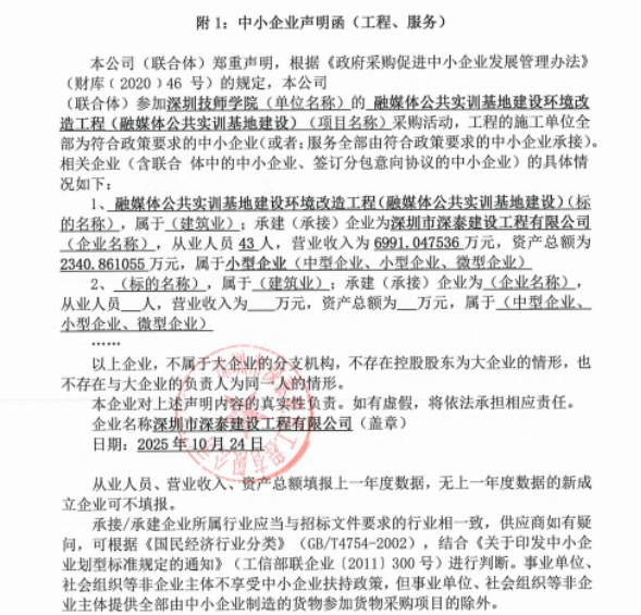 参照国家和深圳市有关招标采购的相关法律法规及政策,中国远东国际招标有限公司(以下简称为采购代理机构)受深圳技师学院(以下简称为采购人)委托实施采购,本项目于2025年10月13日发布采购公告,定于2025年10月24日在深圳市龙岗区龙城大道126号维百盛大厦9楼911进行开标和评审,2025年10月24日定标。现中标(成交)结果已经采购单位确认,特此公告如下: