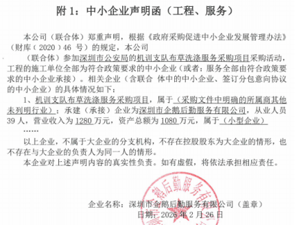| 1 | 深圳市企鹅后勤服务有限公司 | 1)营业执照(或事业单位法人证书)等证明资料复印件;2)法定代表人证明书;3)法定代表人授权书;4)政府采购投标及履约承诺函;5)招标代理服务费承诺书;6)投标报价;7)《供应商基本情况表》、社保缴纳证明材料、股权关系证明材料;8)投标人须具备有效的《城镇污水排入排水管网许可证》或《固定污染源排污登记回执》或《排污许可证》等污染物排放相关许可证明文件。 结论:资格核查通过。 | 98.00% |