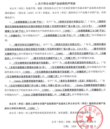 | 3 | 交互演绎展示场景配套开发装置 | 1、裸眼3D全息风扇屏2、板材材料集合展示箱3、美工字工艺展示箱4、展览灯具展示箱5、LED灯带教学教具灯光展示册6、教学用汽车油漆色板展示箱7、铝型材教学教具展示箱8、3D全息触摸液晶透明屏9、硅胶套管(灯带专用)教学展示集合箱10、伴学机器人(AI对话版) | 10 | 套 | ¥4,000 | ¥40,000 |