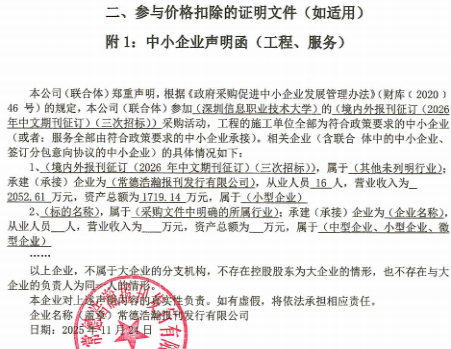 | 4 | 常德浩瀚报刊发行有限公司 | 1)营业执照(或事业单位法人证书)等证明资料复印件;2)法定代表人证明书;3)法定代表人授权书;4)政府采购投标及履约承诺函;5)招标代理服务费承诺书;6)投标报价;7)《供应商基本情况表》、社保缴纳证明材料、股权关系证明材料;8)具有相关部门颁发的《出版物经营许可证》;9)未被记入深圳信息职业技术大学诚信档案。 结论:资格核查通过。 | 75.00% |