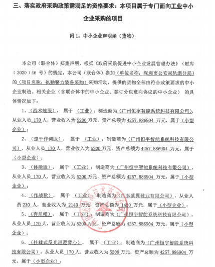 | 1 | 广州戎缮警用装备科技有限公司 | 1)营业执照(或事业单位法人证书)等证明资料复印件;2)法定代表人证明书;3)法定代表人授权书;4)政府采购投标及履约承诺函;5)招标代理服务费承诺书;6)投标报价;7)《供应商基本情况表》、社保缴纳证明材料、股权关系证明材料;8)落实政府采购政策需满足的资格要求:本项目属于专门面向工业中小企业采购的项目。 结论:资格核查通过。 | ¥464,930.00 |