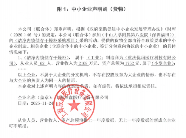 | A | 深圳金视成医疗科技有限公司 | 1)营业执照(或事业单位法人证书)等证明资料复印件;2)法定代表人证明书;3)法定代表人授权书;4)政府采购投标及履约承诺函;5)招标代理服务费承诺书;6)投标报价;7)《供应商基本情况表》、社保缴纳证明材料;8)签约承诺函;9)若投标供应商为所投产品的生产企业,必须提供《医疗器械生产企业许可(备案)证》且生产范围包含该产品,不在住所或者生产地址所在地销售的厂家还需提供医疗器械经营许可证/(第一类/二类)医疗器械经营备案凭证;若投标供应商为所投产品的代理商或授权供应商,必须提供《医疗器械经营企业许可(备案)证》且经营范围包含该产品。 结论:资格核查通过。 | ¥300,000.00 |