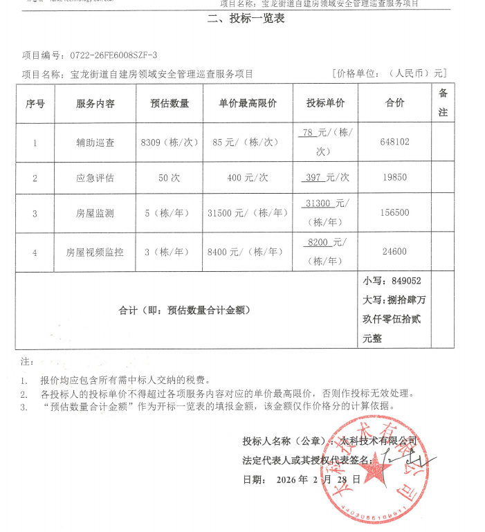 | 2 | 太科技术有限公司 | 1)《营业执照》或机构团体《法人证书》或事务机构《执业许可证》等独立承担民事责任能力的登记证明文件复印件;2)法人代表证明书;3)法定代表人授权书;4)投标人《政府采购投标及履约承诺函》;5)招标代理服务费承诺书;6)投标报价;7)《供应商基本情况表》、社保缴纳证明材料、股权关系证明材料。结论:资格核查通过。 | ¥849,052.00 | 96.9691 | 1 |