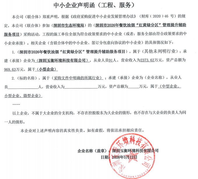 3.服务范围:深圳市2026年餐饮油烟“红黄绿分区”管理提升辅助服务,详见招标文件第二章用户需求书。