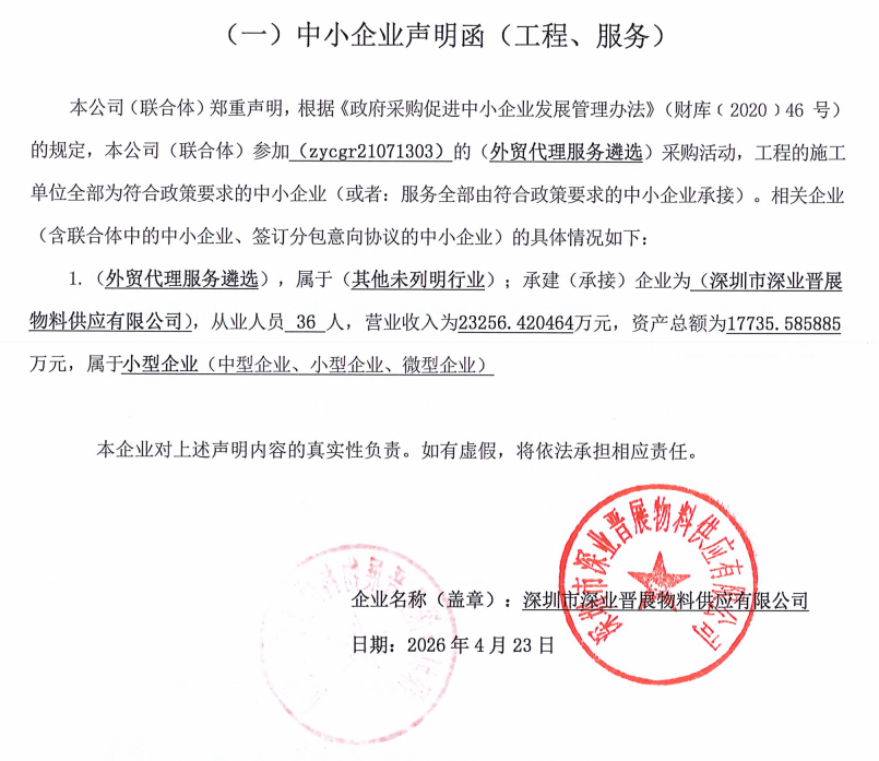 参照国家和深圳市有关招标采购的相关法律法规及政策,中国远东国际招标有限公司(以下简称采购代理机构)受zycgr21071303(以下简称为采购人)委托实施采购,本项目于2026年04月02日发布遴选公告,定于2026年04月23日在深圳市福田区上步南路1001号锦峰大厦22楼进行开标和评审,现结果已经采购单位确认,特此公告如下: