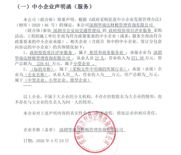 | 1 | 深圳华瑞达财税管理咨询有限公司 | 1)营业执照(或事业单位法人证书)等证明资料复印件;2)法定代表人证明书;3)法定代表人授权书;4)政府采购投标及履约承诺函;5)招标代理服务费承诺书;6)投标报价;7)《供应商基本情况表》、社保缴纳证明材料、股权关系证明材料;8)落实政府采购政策需满足的资格要求:本项目属于专门面向其他未列明行业中型、小型或微型企业采购的项目。结论:资格核查通过。 | 95.00% |
